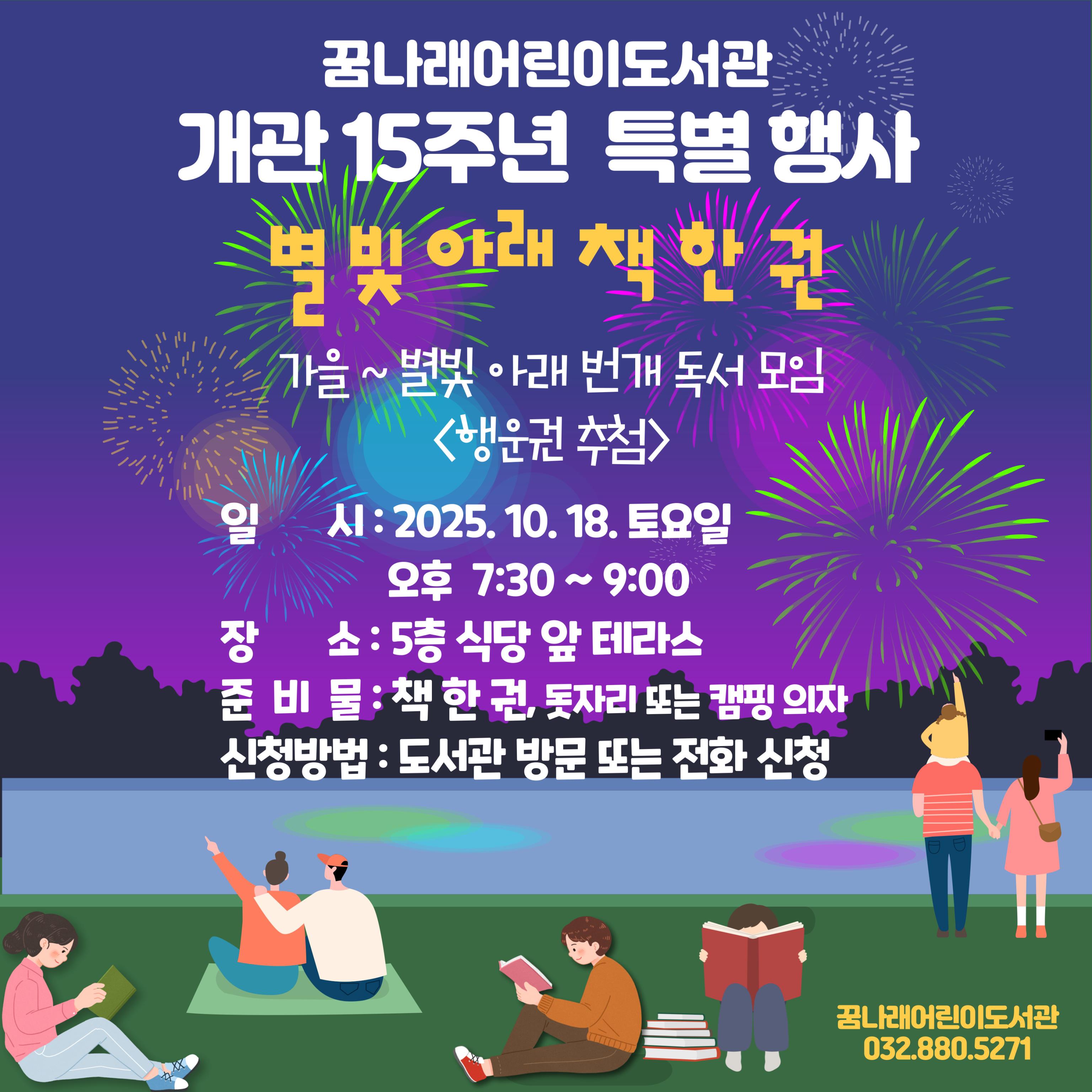 꿈나래어린이도서관이 벌써 개관15주년입니다.그동안 도서관을 사랑해 주신 운영위원회, 꿈나르미 봉사자, 이용자 분들께 감사드립니다.부모님이 책을 읽어 주던 아이들이 어느새 성인이 되어 스스로 책을 빌리러 옵니다.성장하는 아이들을 보면 참 보람이 큽니다.앞으로도 노력하는 꿈나래어린이도서관이 되겠습니다. 😊